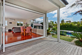 This spacious open plan living and dining area flows to the private gardens and pool area, landscaped by top designer Robyn Shafer and featured in Next magazine.