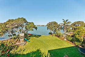 Downstairs are four bedrooms and a bathroom. Two of these bedrooms have sliding doors opening to the wide flat lawn that leads to the water edge.