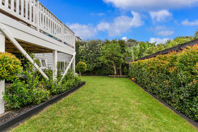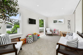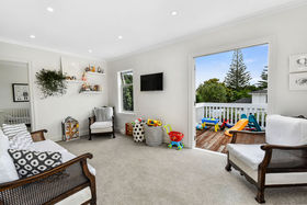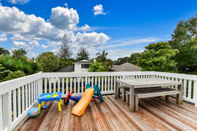 A sunny family room/children's play area opens out to the north facing deck and staircase down to the flat sunny fully fenced lawn.