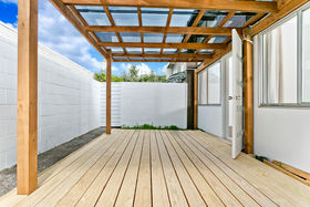 * Sunny sheltered fenced courtyard with customized built pergola over new timber deck.